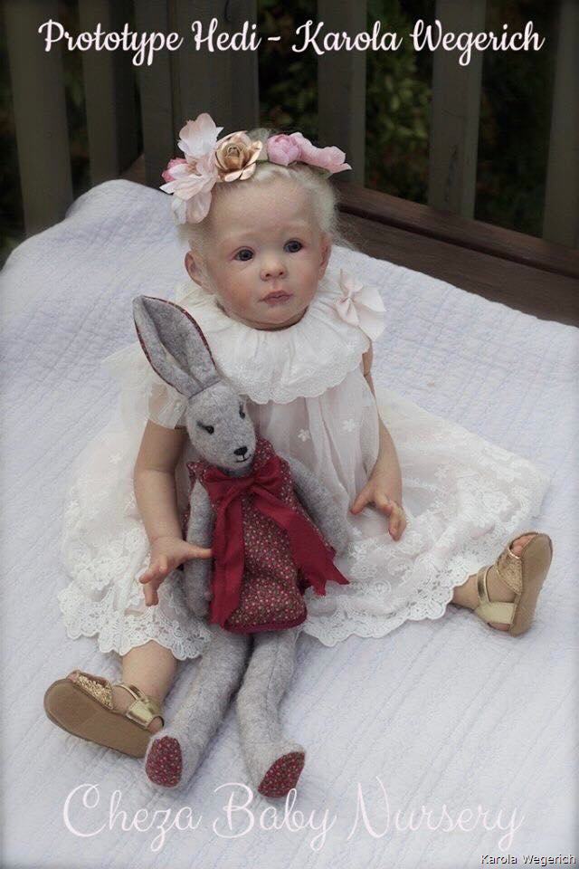Kit Hedilimited to 555 kitsHedi is supplied with a body customized for herVinyl Kit in size 24 ", approx. 62 cmArms 3/4Legs 1/1 - standingHead circumference 42 cmEye size is 22 mmtotal price 139,95 EUR plus shippingKit Hedi
